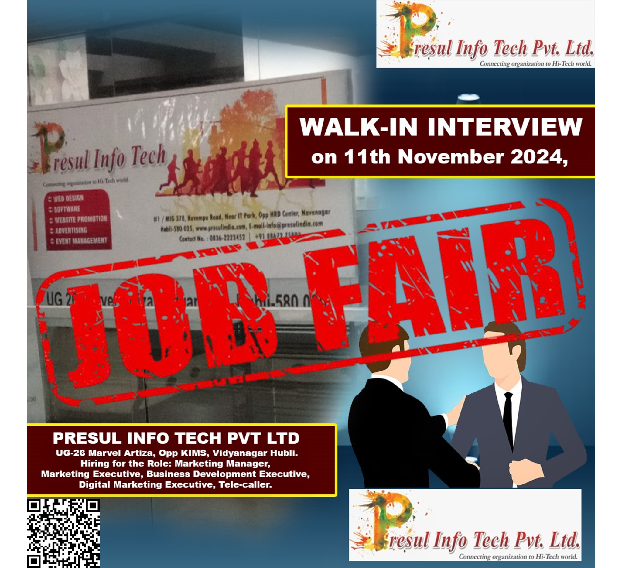 WALK-IN INTERVIEW on 11th November 2024, Morning 10:00AM-02:00PM, Walk-IN Interview Venue:PRESUL INFO TECH PVT LTD, UG-26 Marvel Artiza, Opp KIMS, Vidyanagar Hubli